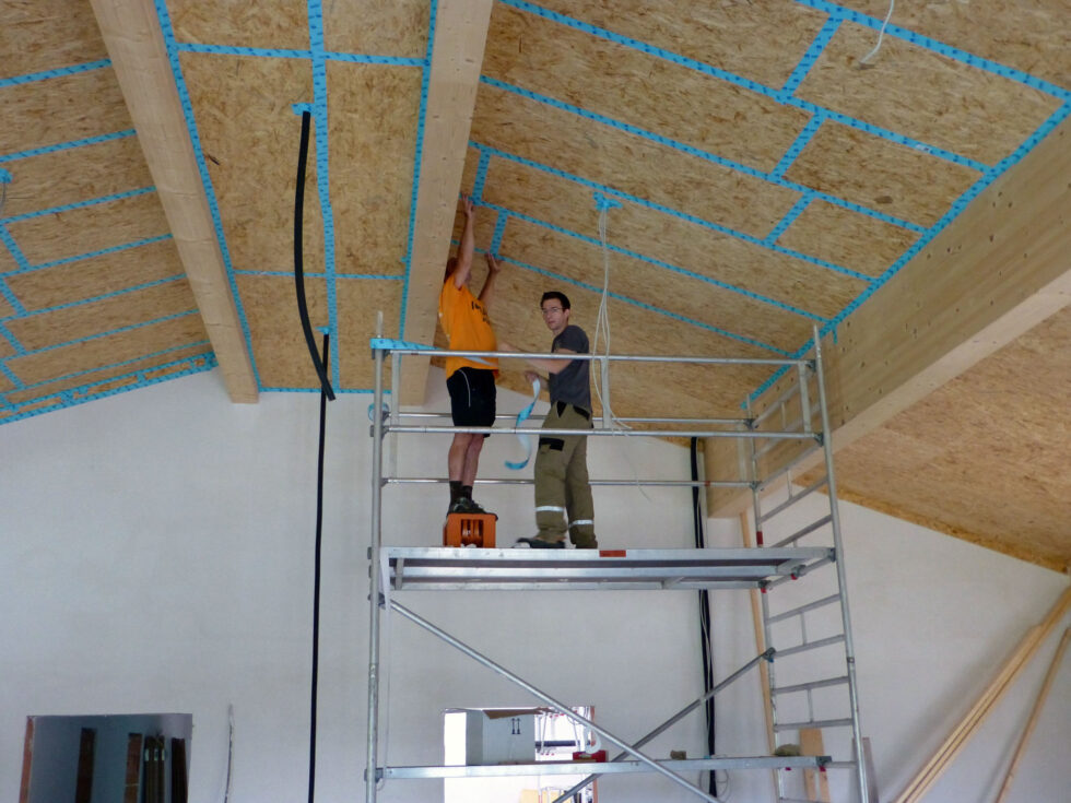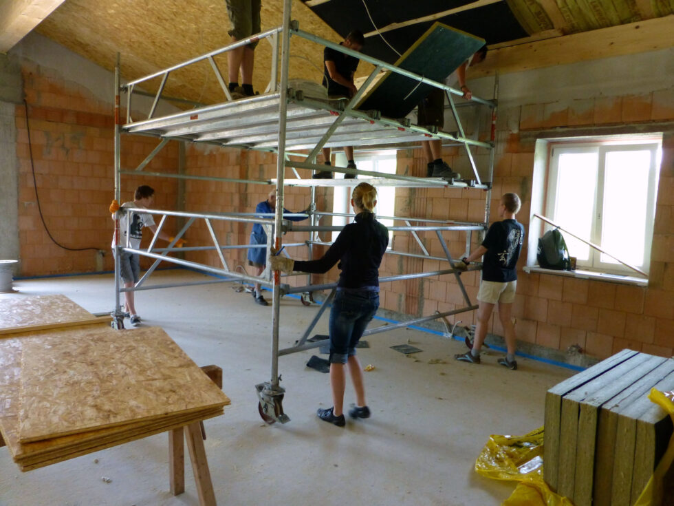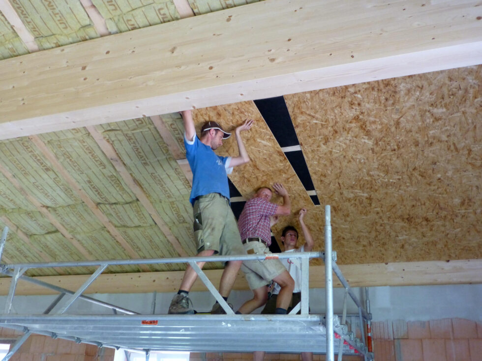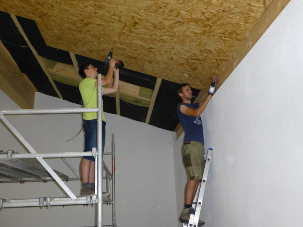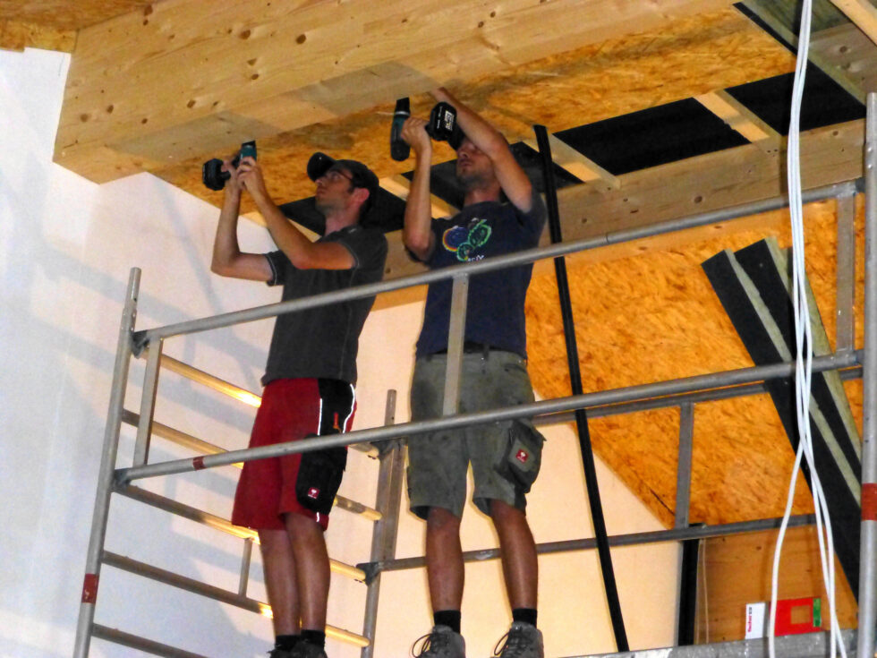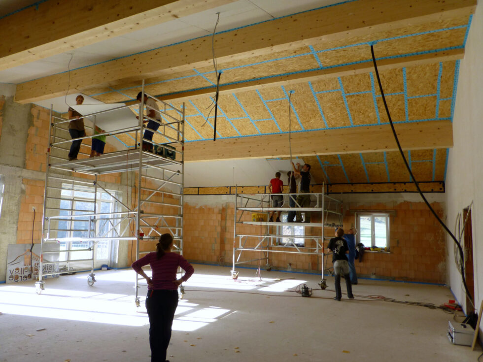 . In kompletter Eigenleistung wurde unter Fachmännischer Anleitung im ersten Stock die Elektronik installiert, gemalert, der Dachstuhl isoliert, die Holzgalerie im Registerproberaum montiert sowie der Boden verlegt. Im November 2013 begann dann der Akustik-Ausbau durch die Firma Fox-Holz aus Österreich, bei der auch täglich mehrere Mitglieder der Musikkapelle mithalfen, um die Kosten gering zu halten.